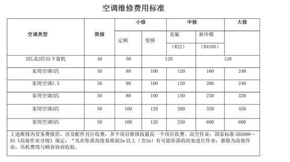 空調(diào)的維修費(fèi)用與空調(diào)的規(guī)格,維修難度以及材料的使用有關(guān),大概的價(jià)格可參考下表:
