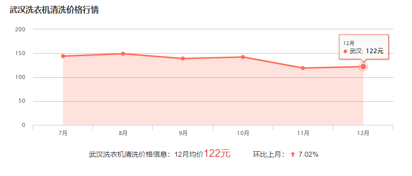 武漢找人清洗洗衣機一般費用在80-200元左右,具體的價格與洗衣機的規(guī)格和清洗難度有關(guān),下面為近幾個月武漢清洗洗衣機的平均價格,可供參考: