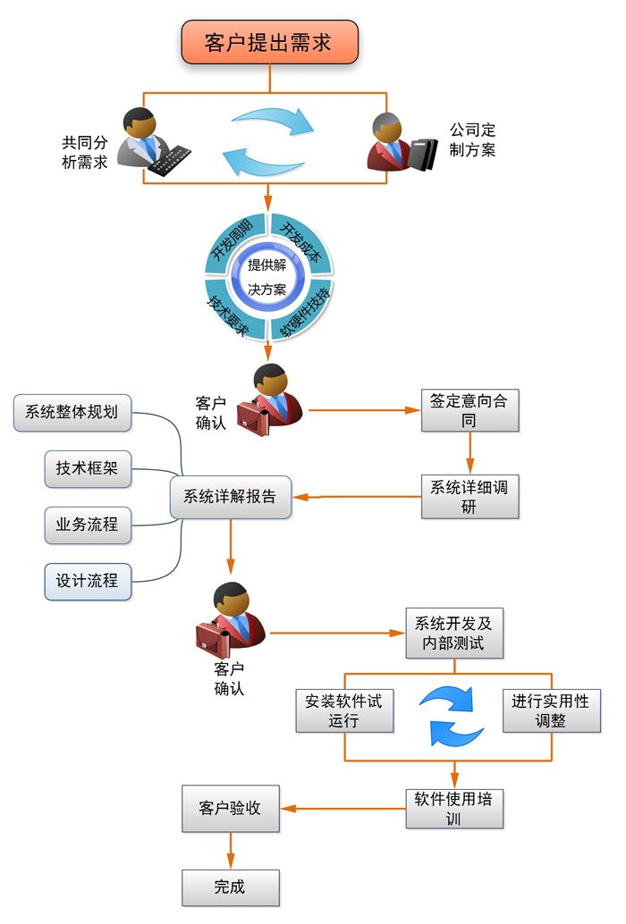 開 發(fā)過程將經(jīng)歷獲取需求、需求分析、系統(tǒng)結(jié)構建立、軟件設計、代碼編寫、軟件測試等階段。 當軟件的后期測試完成后,通知業(yè)務需求人員驗收,驗收主要以業(yè)務 需求人員提供的原始資料及《軟件定制開發(fā)需求書》為依據(jù),對軟件的各項功能進行全面的核查, 如無異議,驗收后簽署“驗收確認書”。項目組有義務對用戶提 供及時、有效、全面的培訓,并在項目實施過程中分重視對用戶方的技術轉(zhuǎn)移,并提前制訂有效可行的培訓計劃。