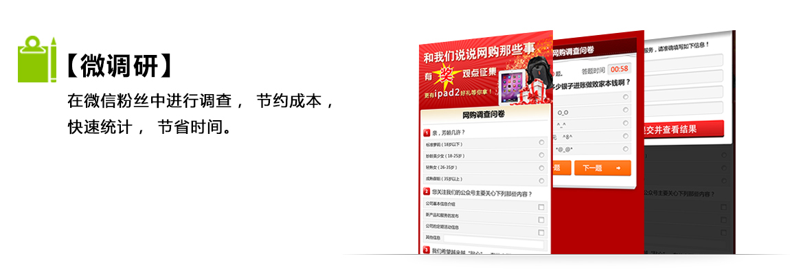 微官網(wǎng) 微商城 微社區(qū) 微信支付 優(yōu)惠劵 微外賣 微名片 微報(bào)名 車主關(guān)懷 微游戲 微訂單-酒店 微團(tuán)購 會(huì)員卡 預(yù)約試駕 汽車保養(yǎng)預(yù)約 課程預(yù)約 會(huì)員管理 KTV預(yù)約 餐廳預(yù)約 圖書預(yù)定 美容預(yù)約 微請(qǐng)柬 問卷調(diào)查 微調(diào)研 微現(xiàn)場(chǎng) 答題闖關(guān) 微請(qǐng)柬 多客服 搖一搖 微配送 微簽到 微測(cè)試 客戶備忘 幸運(yùn)卡牌 客戶備忘