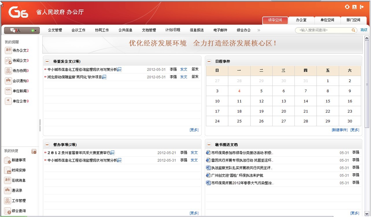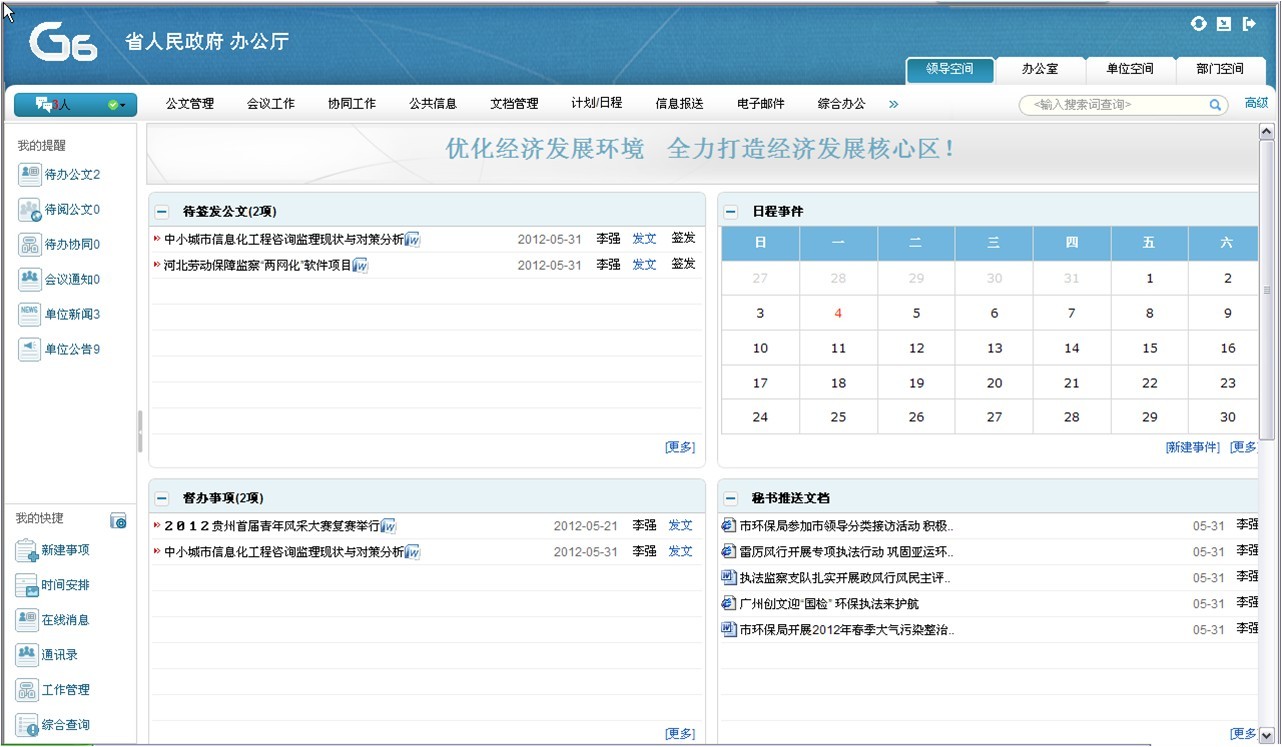通過(guò)統(tǒng)一的用戶(hù)界面把系統(tǒng)中各個(gè)模塊的信息科學(xué)的、有機(jī)的展現(xiàn)出來(lái),方便用戶(hù)第一時(shí)間了解自己待辦、待閱的各種公文、會(huì)議、通知、公告、新聞等。