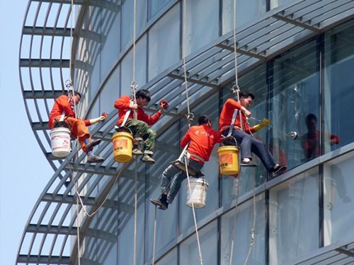 2、吊籃方式:在樓頂架設(shè)吊籃將工人運送到指定位置進行施工操作。此施工方式清洗效率較低,成本較高。