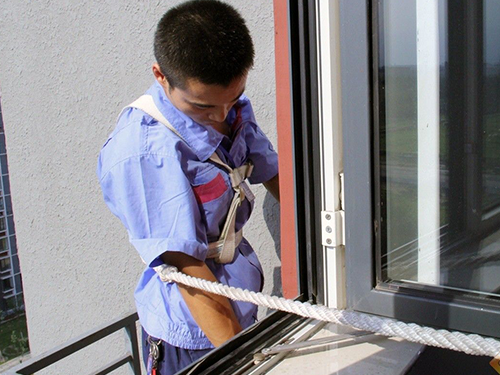 9、把室外機(jī)拆掉包裝,用繩子捆綁牢固,從窗戶出室外,出去后放在支架上后戴上減震墊。人要系緊安全帶。